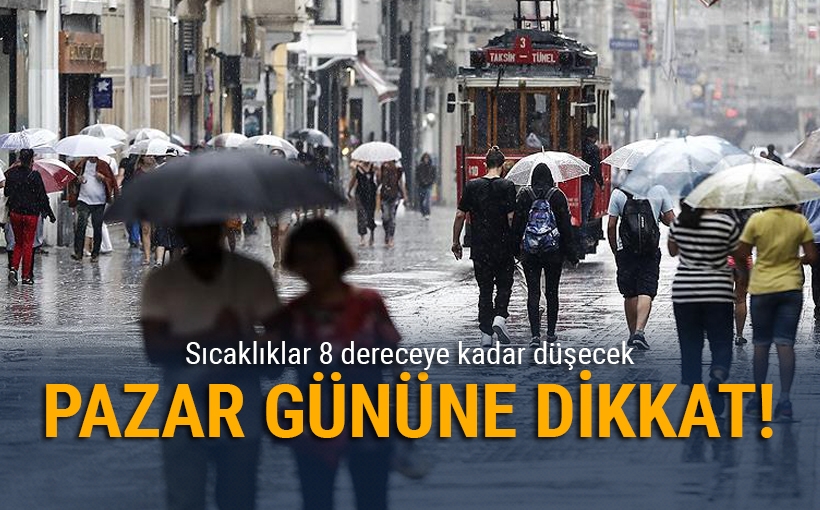 Türkiye'de pazar günü yağış alacak illerde sıcaklıklar 8 dereceye kadar düşecek. İstanbul'da akşam saatlerinde Avrupa Yakası'nde başlayacak yağmur gece saatlerinde sağanak yağışa dönecek. Marmara, Ege, Batı Akdeniz ve İç Anadolu'nun kuzeybatısı pazar günü yağış alacak dolayısıyla sıcaklıklar düşecek. Doğu Anadolu'nun iç kesimlerinde ise yer yer kar yağışı bekleniyor.