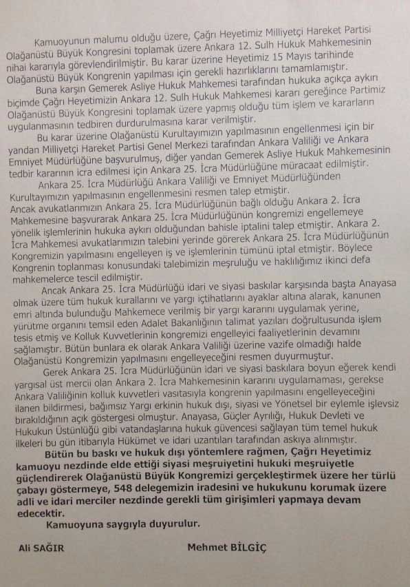 Açıklamada ayrıca "Bütün bu anayasa ve yasaların çiğnenmesi ve fiili baskı ve engellemelere rağmen MHP Genel Başkan adayları 15 Mayıs 2016 tarihinde saat 10.00'da kurultayımızın yapılacağı adreste olacağımızı kamuoyuna saygıyla bildiririz." ifadelerine yer verdi.