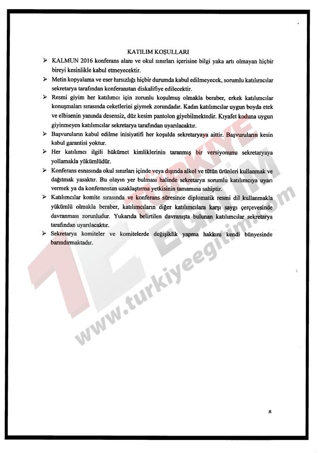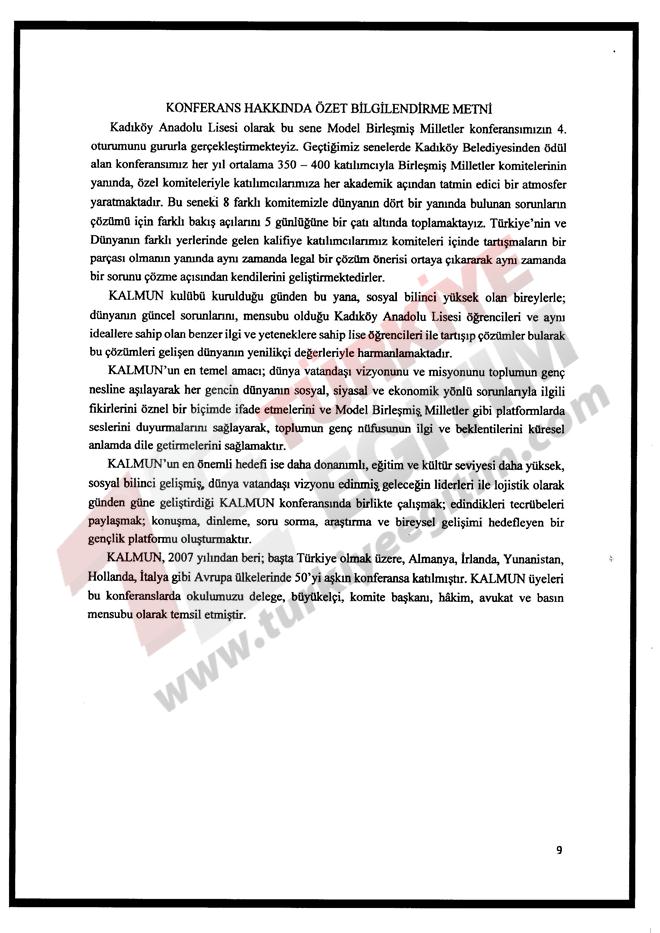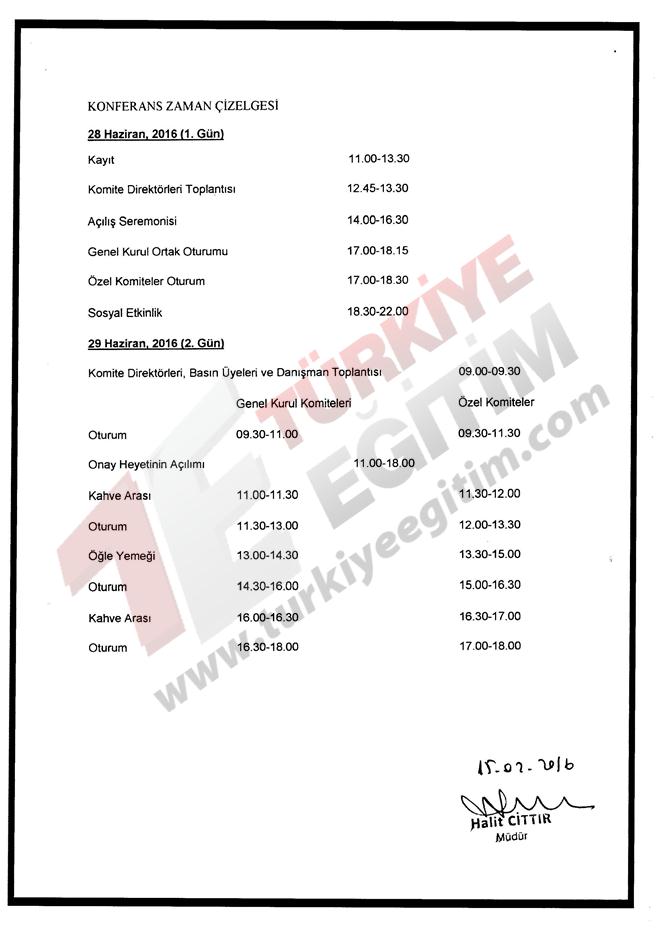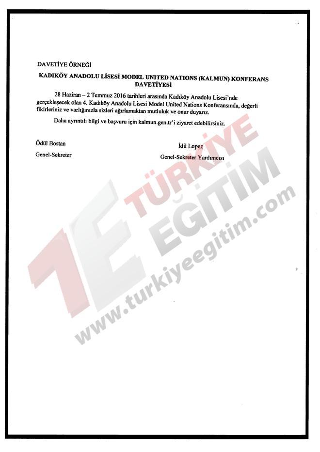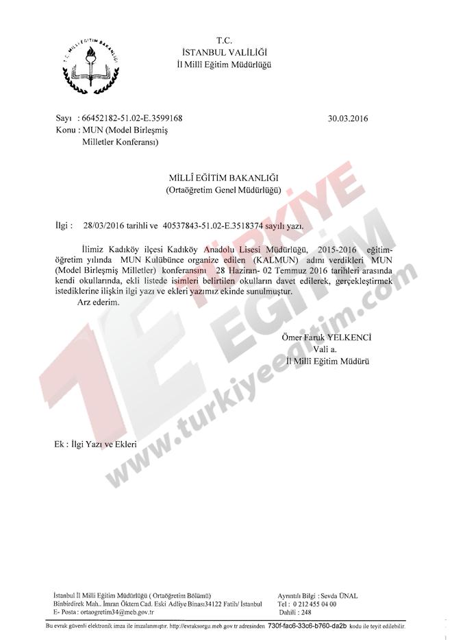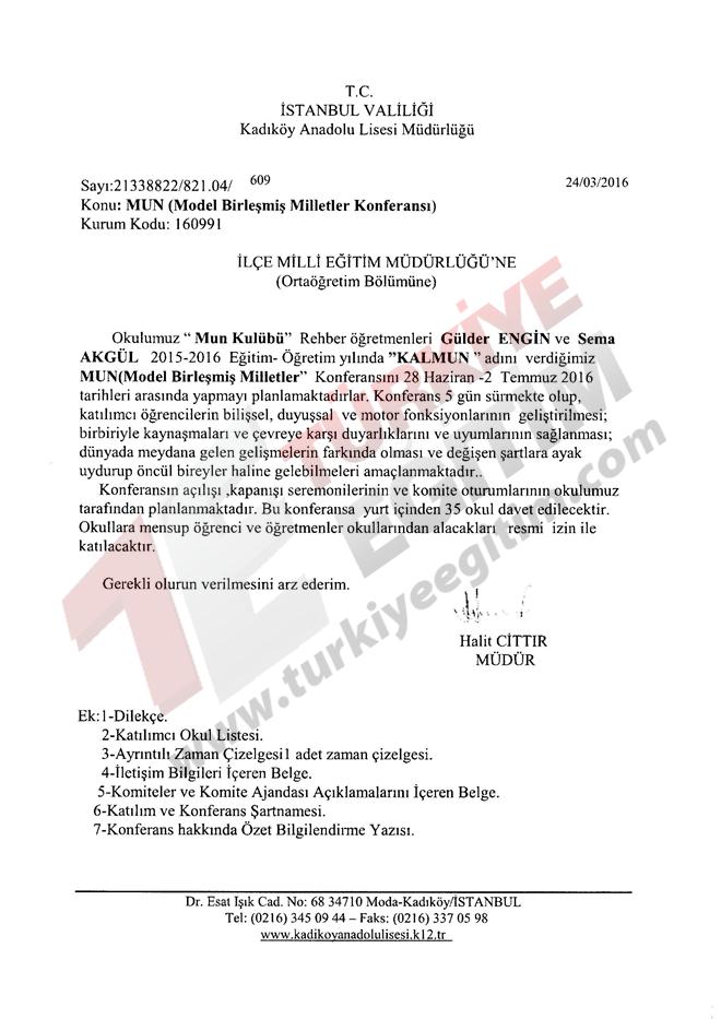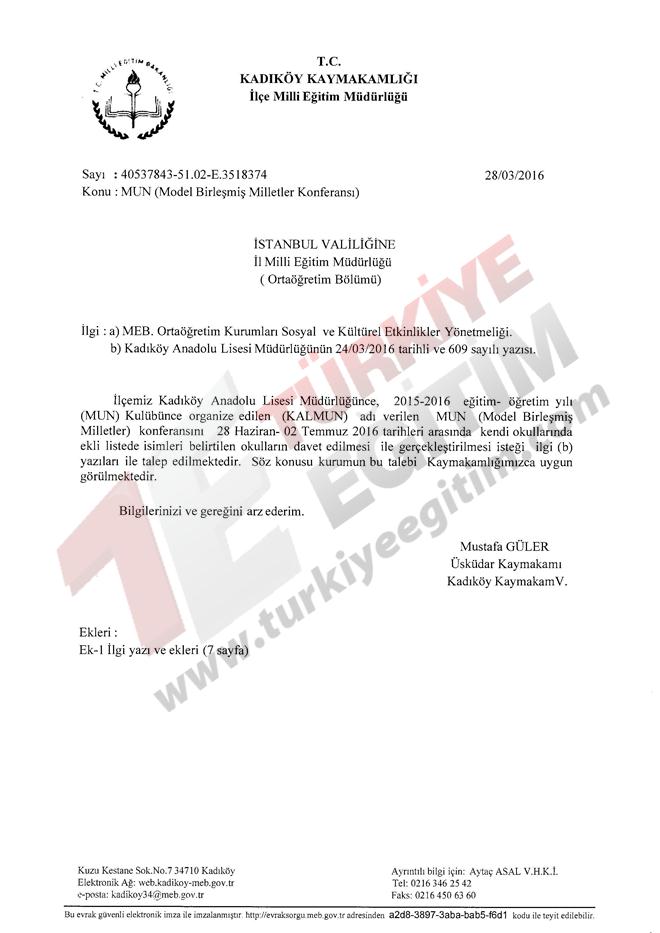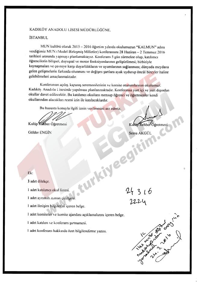 İstanbul ili Kadıköy ilçesinde faaliyet gösteren Kadıköy Anadolu Lisesi Müdürlüğünün; 28 Haziran-02 Temmuz 2016 tarihleri arasında, Türkiye geneli resmi/özel tüm lise ve dengi okul öğrencilerine yönelik "Model Birleşmiş Milletler Konferansı" düzenleme talebine ilişkin ilgi yazı ve ekleri incelenmiştir.