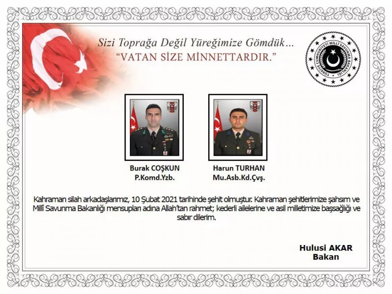 Bakanlıktan yapılan yazılı açıklamada, "Irak kuzeyi Gara bölgesinde başlatılan Pençe Kartal-2 Harekatında 10 Şubat 2021 tarihinde teröristlerle çıkan çatışma sonucunda iki kahraman silah arkadaşımız şehit olmuş, dört kahraman silah arkadaşımız ise yaralanmış ve derhal hastaneye sevk edilmiştir. Bölgede tespit edilen hedefler hava harekatı ile isabetle vurulmuş, terör örgütünün söz konusu bölgedeki varlığına ağır bir darbe indirilmiştir. Bizleri derin bir acı ve üzüntüye boğan bu olayda hayatını kaybeden aziz şehitlerimize Allah'tan rahmet, kederli ailelerine, Türk Silahlı Kuvvetleri ile asil milletimize başsağlığı ve sabır, yaralı personelimiz için acil şifalar dileriz" denildi.