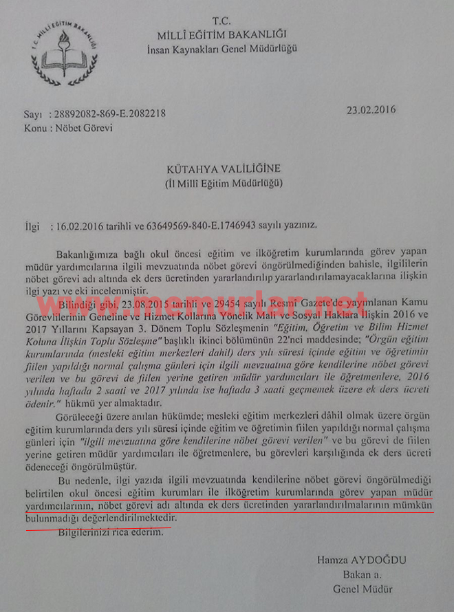 MEB İnsan Kaynakları Genel Müdürlüğü yaptığı açıklamada, okul öncesi eğitim kurumları ile ilköğretim kurumlarında görev yapan müdür yardımcılarının nöbet görevi ücreti alamayacağını belirtti.