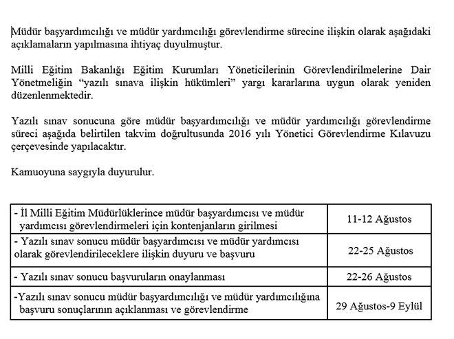 Yazılı sınav sonucu başvurular, 22-26 Ağustos'ta onaylanacak. Yazılı sınav sonucu müdür başyardımcılığı ve müdür yardımcılığına başvuru sonuçları 29 Ağustos-9 Eylül'de açıklanacak ve görevlendirmeler de aynı tarih aralığında yapılacak.