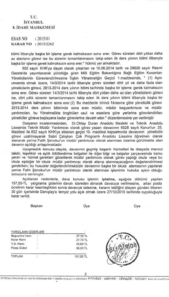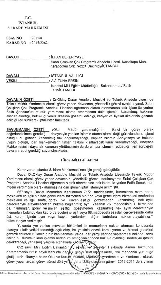 İstanbul 8. İdare Mahkemesi, Dr. Oktay Duran Anadolu Mesleki ve Teknik Anadolu Lisesi’nde Teknik Müdür Yardımcısı olarak görev yapan Sendikamız üyesi davacı İlhan Beker Yaylı’nın, yöneticilik görevinin uzatılmayarak Sabri Çalışkan Çok Programlı Anadolu Lisesi’ne öğretmen olarak atanmasına dair işlem ile yerine Fatih Şenokur’un Müdür Yardımcısı olarak atanmasına dair işleme ilişkin; “kazanılmış hakkının elinden alındığı, hukuki güvenlik ilkesi ile kariyer ve liyakat ilkesinin göz ardı edildiği” şeklindeki talebini yerinde bularak dava konusu işlemin iptaline karar vermiştir. Her ne kadar Davalı İdare tarafından yapılan savunmada, okul Müdür Yardımcılığının ikinci bir görev olarak değerlendirilmesi gerektiği, dolayısıyla yapılan işlemin bir atama işlemi değil; görevlendirme işlemi olduğu, bu görevin kazanılmış hak kavramını doğurmayacağı, yapılan işlemin Anayasa ve ilgili Mevzuata uygun olduğu, İdare Mahkemeleri’nin de İdarenin takdir yetkisini kısıtlayacak kararlar alamayacağı ve Anayasa Mahkemesi’nin dayanak kanun hakkında yürütmenin durdurulması istemini reddettiği ileri sürülse de; Mahkeme gerekçeli kararında, “memurların naklen atanmasında İdare takdir yetkisi tanındığı açık olup, bu yetkinin ancak kamu yararı ve hizmet gerekleri göz ardı edilerek kullandığının saptanması halinde ilgili işlemin hukuka aykırılık teşkil edeceği, uyuşmazlık konu olayda davacının geçmiş başarı ve hizmetlerini değerlendirilmeksizin davacının başka bir okula atanarak yerine Fatih Şenokur’un Müdür Yardımcısı olarak atanması işleminin hukuka aykırı olduğunu” vurgulayarak davaya konu işlemin iptaline hükmetmiştir.