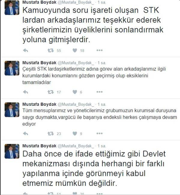 Boydak, Twitter hesabından yaptığı açıklamada bundan böyle herhangi bir cemaat ve camia ile anılmak istemediklerini belirterek, "Çeşitli STK'larda şirketlerimiz adına görev alan arkadaşlarımız ilgili kurumlardaki konumlarını gözden geçirmiş olup eksiklerini tamamladılar. Kamuoyunda soru işareti oluşan STK'lardan arkadaşlarımız teşekkür ederek şirketlerimizin üyeliklerini sonlandırmak yoluna gitmişlerdir.