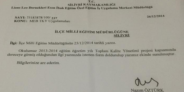 MEB Eğitimde Toplam Kalite Yönetimi Uygulamalar ı Ödül Yönetmeliği kapsamında, her İlçe de olduğu gibi, Silivri İlçe Milli Eğitim Müdürlüğü de okullara bir yazı yazarak,2013/2014 Eğitim-Öğretim yılında toplam kalite yönetimi yarışmasında dereceye giren okullardan, okulun ekibinde yer alan öğretmen bilgileri istenmiştir. Okullar,kendilerinden istenen belgeleri kurum net üzerinde 26.12.2015 tarihi itibarıyla İlçe Milli Eğitim Müdürlüğüne gönderiyorlar. Buraya kadar her şey normal işliyor.Ancak;ödüller bir türlü verilemiyor.