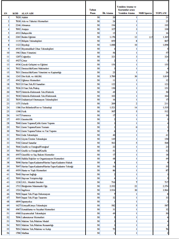 Öğretmen Atama Kontenjanları Branş Dağılımı Listesi 2016