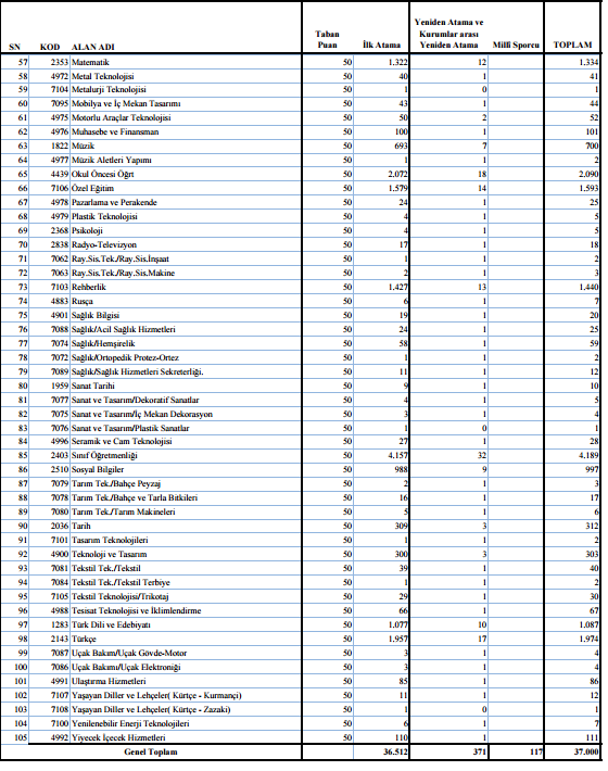 Eylül 2015 öğretmen atama kontenjanları ve branş dağılımları 2015 listesi aşağıdaki gibiydi.