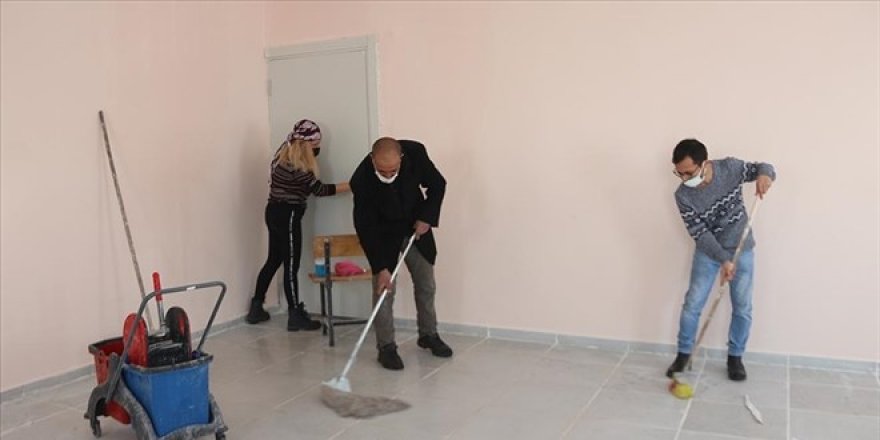 Sınıfları süsleyip dezenfekte eden öğretmenler, okulu yüz yüze eğitime hazır hale getirerek heyecanla öğrencilerine kavuşacakları günü beklemeye başladı.