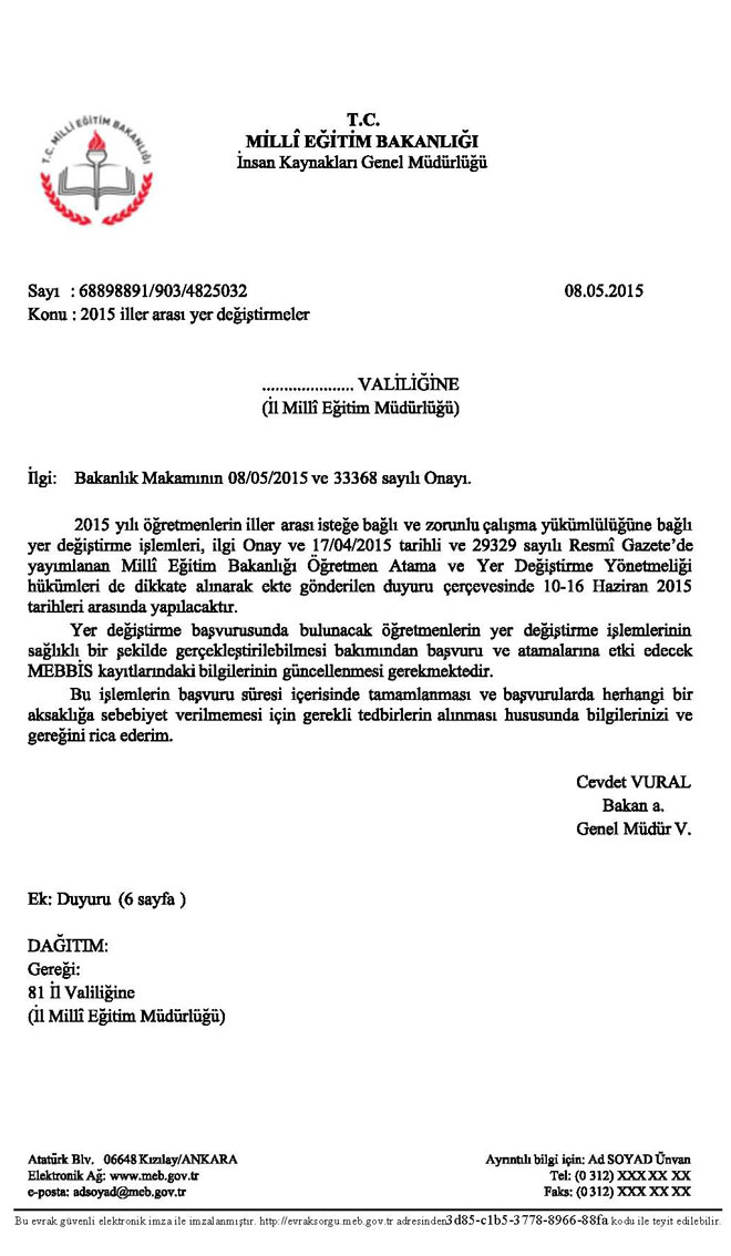 ÖĞRETMENLERİN 2015 YILI İLLER ARASI İSTEĞE VE ZORUNLU ÇALIŞMA YÜKÜMLÜLÜĞÜNE BAĞLI YER DEĞİŞTİRMELERİNE İLİŞKİN DUYURU