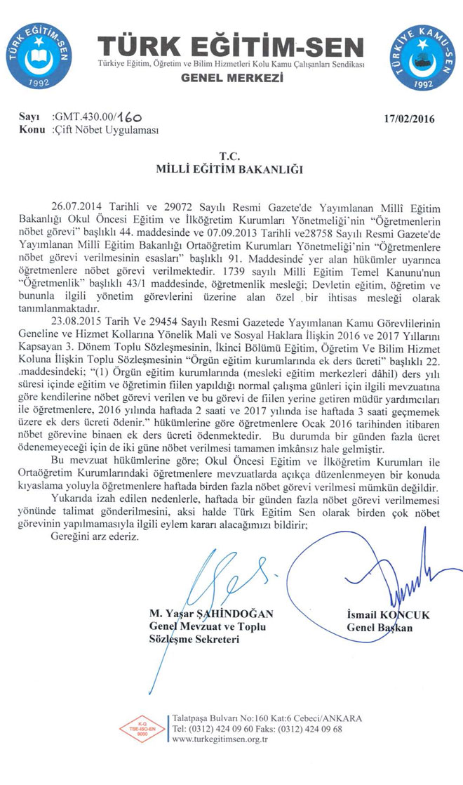 Türk Eğitim Sen olarak Bakanlığa gönderdiğimiz yazıda, haftada bir günden fazla nöbet görevi verilmemesi yönünde talimat gönderilmesini talep ederek, aksi halde Türk Eğitim Sen olarak haftada birden çok nöbet görevinin yapılmamasıyla ilgili eylem kararı alacağımızı bildirdik.