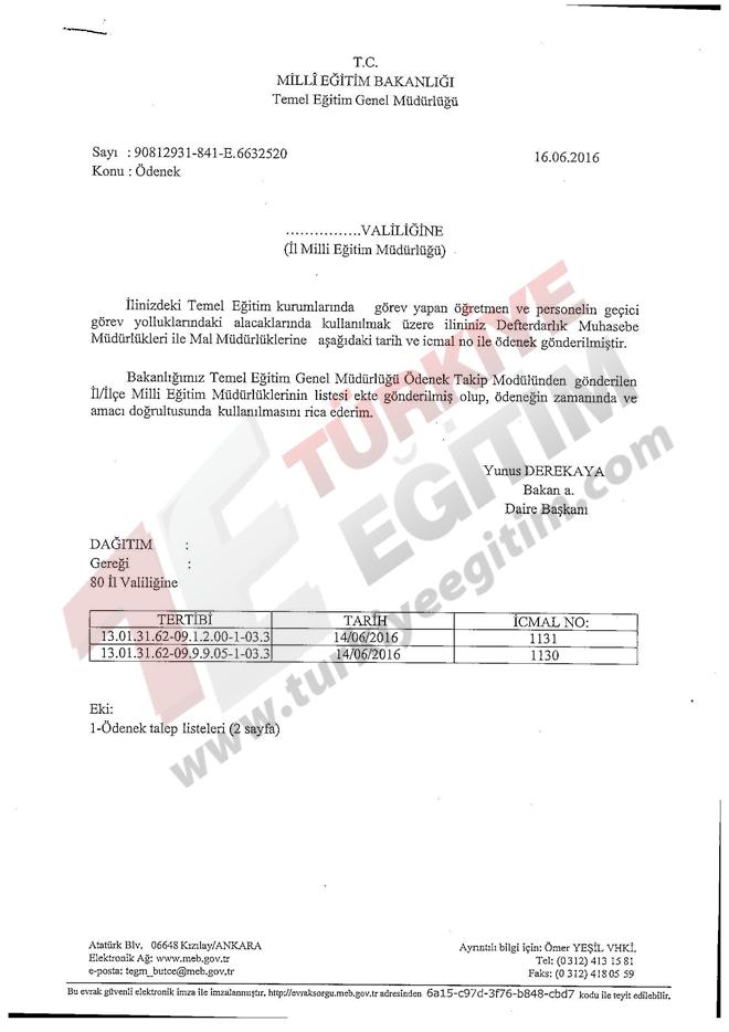 İlinizdeki Temel Eğitim kurumlarında görev yapan öğretmen ve personelin geçici görev yolluklarındaki alacaklarında kullanılmak üzere ilininiz Defterdarlık Muhasebe Müdürlükleri ile Mal Müdürlüklerine aşağıdaki tarih ve icmal no ile ödenek gönderilmiştir.