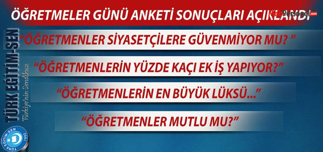 TÜRK EĞİTİM-SEN 24 KASIM ÖĞRETMENLER GÜNÜ ANKETİ SONUÇLARINI AÇIKLADI. Türk Eğitim-Sen her yıl olduğu gibi bu yıl da öğretmenlerin sosyo-ekonomik durumlarını, mesleki sorunlarını tespit edebilmek amacıyla bir anket çalışması gerçekleştirdi.