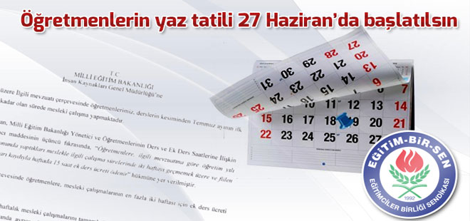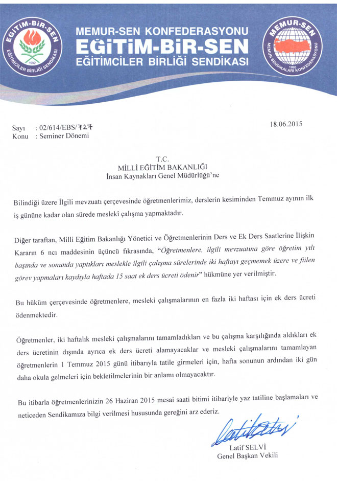 Eğitim-Bir-Sen olarak, Milli Eğitim Bakanlığı’na başvuruda bulunarak, öğretmenlerin yaz tatiline erken girebilmeleri için, seminer döneminin 26 Haziran 2015 tarihinde sonlandırılmasını talep ettik.