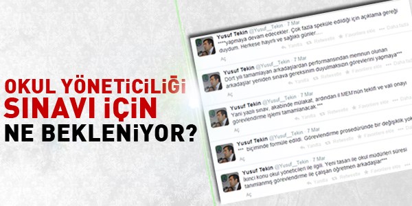 MEB Müsteşarı Yusuf Tekin, okul yöneticiliği için 4 yıllık süre şartı getirilmeye çalışılırken, sınavla atamanın yapılacağını belirtmişti. Ancak sınavdan hala hiç haber yok