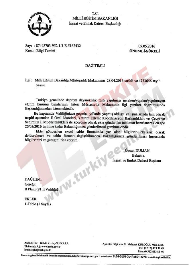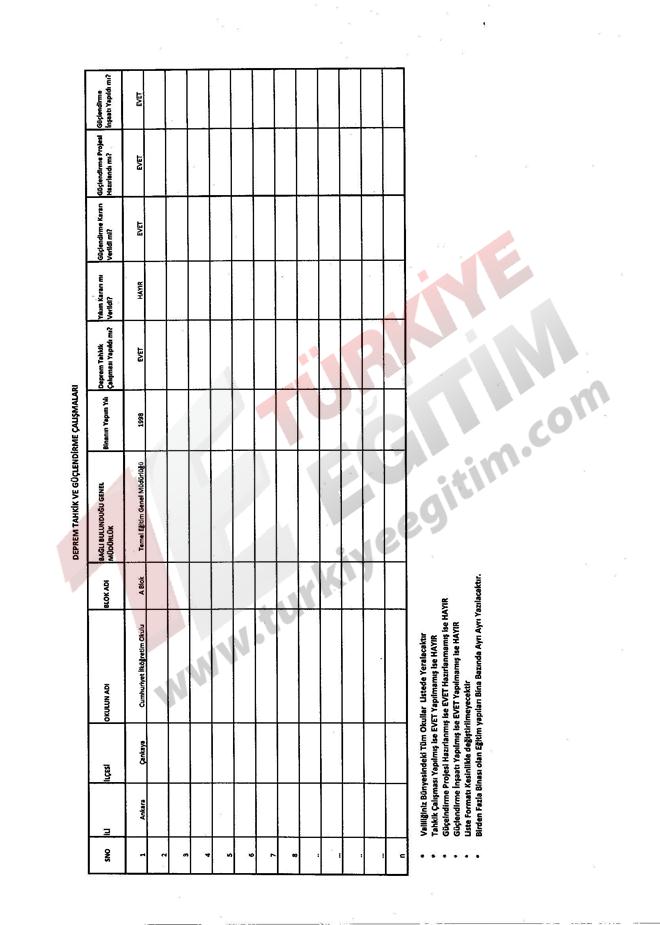 Türkiye genelinde deprem dayanıklılık testi yapılması gereken/yapılan/yapılmayan eğitim kurumu binalarının listesi Müsteşarlık Makamının ilgi yazılan doğrultusunda Başkanlığımızdan istenmektedir.