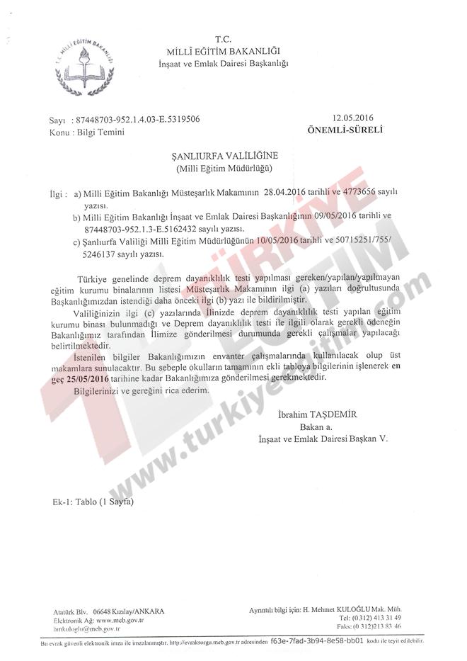 MİLLÎ EĞİTİM BAKANLIĞI İnşaat ve Emlak Dairesi Başkanlığı'ndan Depreme Dayanıklılık Testi Yazısı: