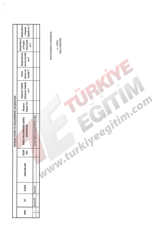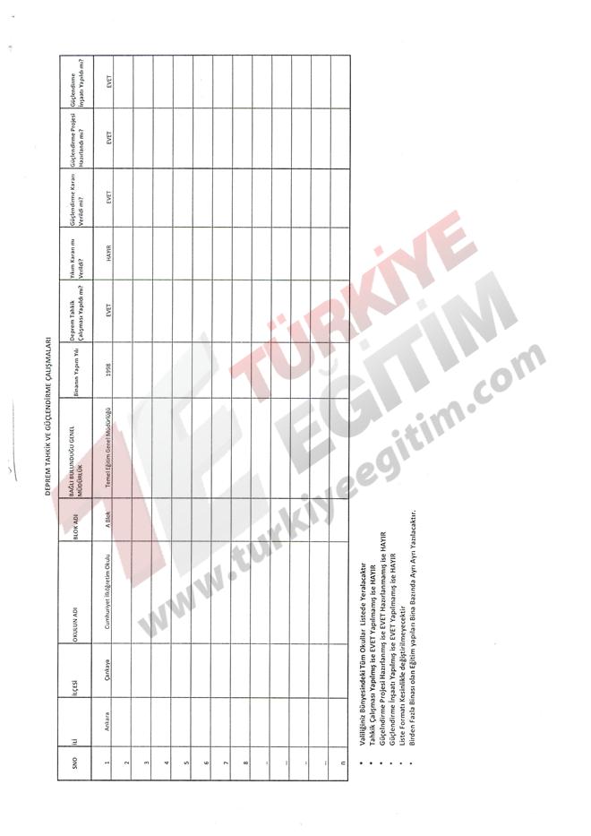 Türkiye genelinde deprem dayanıklılık testi yapılması gereken/yapılan/yapılmayan eğitim kurumu binalarının listesi Müsteşarlık Makamının ilgi (a) yazıları doğrultusunda Başkanlığımızdan istendiği daha önceki ilgi (b) yazı ile bildirilmiştir.