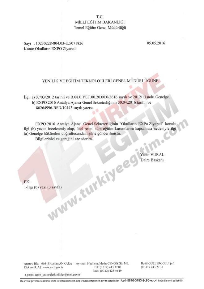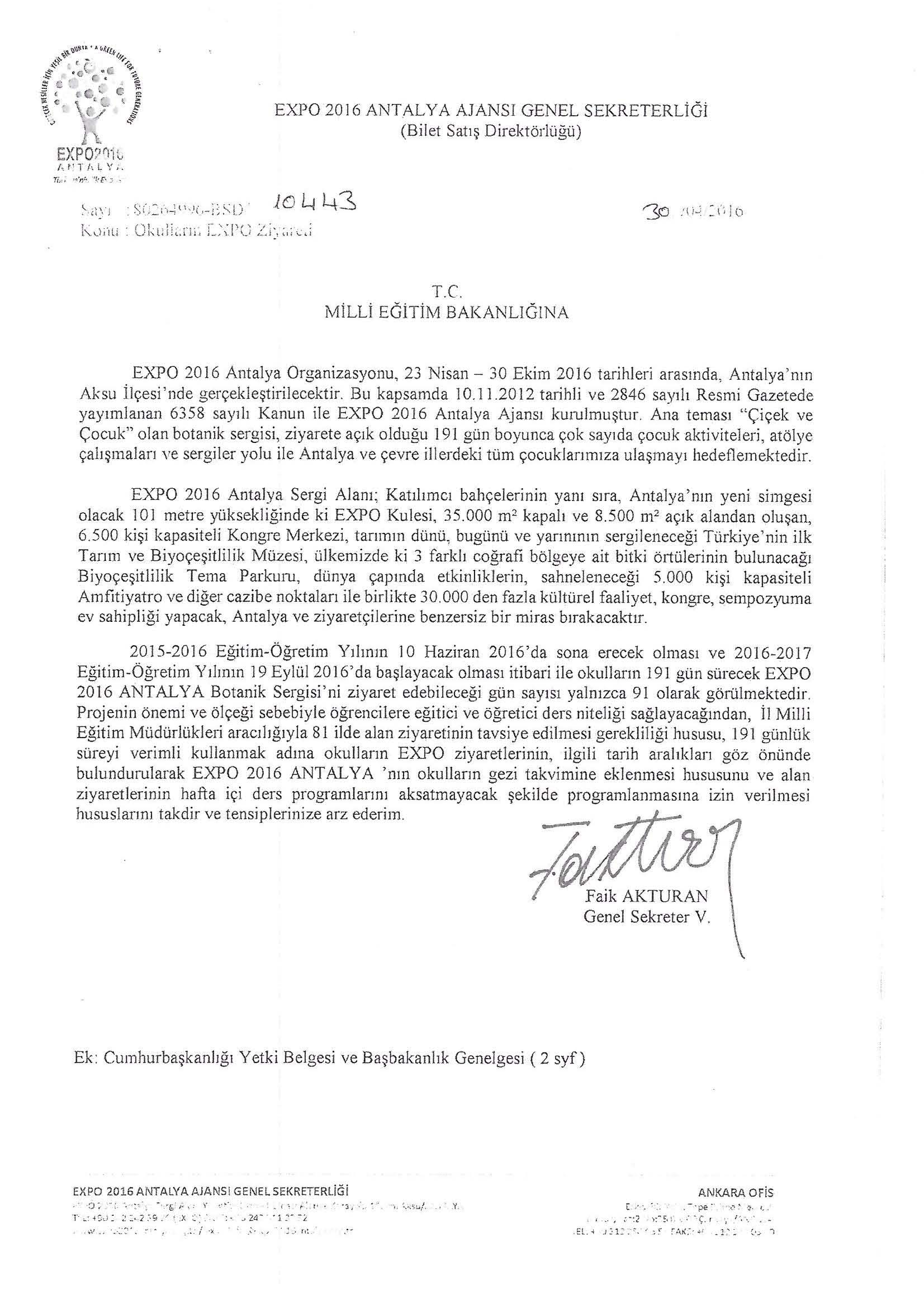 MEB'in EXP0 2016 Antalya Ajansı Genel Sekreterliğinin "Okulların EXPo Ziyareti" konulu yazısı