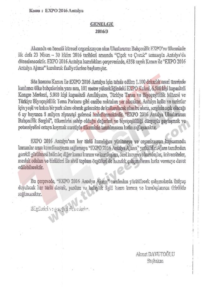EXP0 2016 Antalya Ajansı Genel Sekreterliğinin "Okulların EXPo Ziyareti" konulu ilgi (b) yazısı incelenmiş olup, özel-resmi tüm eğitim kurumlarını kapsaması nedeniyle ilgi (a) Genelge hükümleri doğrultusunda ilişikte gönderilmiştir.