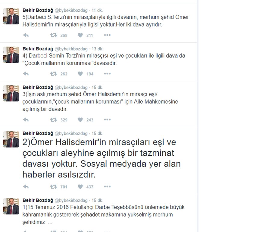 1- Şehit #ÖmerHalisdemir'in ailesine dava açıldığına dair haberler üzerine Sn Cumhurbaşkanımız konunun araştırılması talimatını vermiştir.