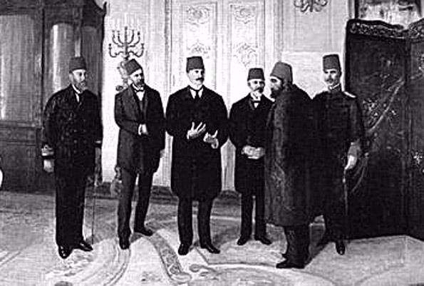 II. Abdülhamid'in tahttan indirildiğini bildiren Aram Efendi,Selanik Mebusu Emanuel Karasu Efendi,Mebusan Meclis'inden Draç Mebusu Jandarma Mirlivası (Tuğgeneral) Esat Paşa ve Bahriye Feriki (Koramiral) Arif Hikmet Paşa'lar