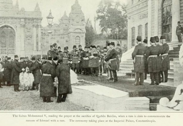 ''Bayram namazı Sultanahmet Camisi'nde eda edildikten sonra Hırka-i Sadet Dairesinin kapısının yanında yaklaşık 40 koç kurban edilir ve ilk koçu bizzat padişah keserdi. Ardından resmi bayramlaşmaya geçilirdi.