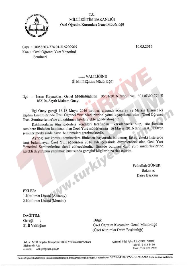 İlgi Onay gereği 16-18 Mayıs 2016 tarihleri arasında Aksaray ve Mersin Hizmet içi Eğitim Enstitülerinde Özel Öğrenci Yurt Müdürlerine yönelik yapılacak olan "Özel Öğrenci Yurt Seminerlerine"ne ait katılımcı listeleri ekte gönderilmişitir.
