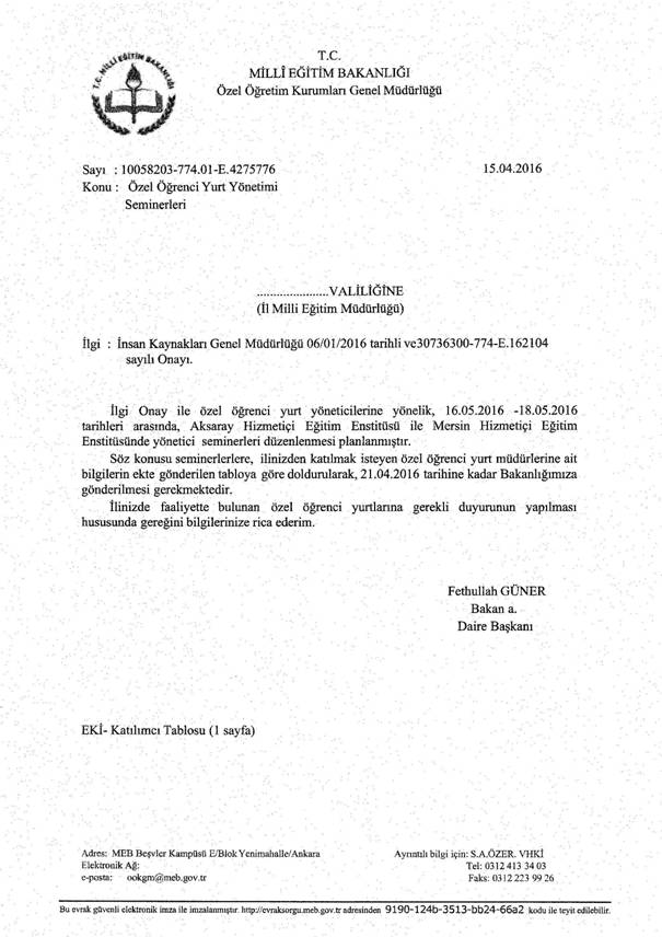 MEB Özel Eğitim Kurumları Genel Müdürlüğü'nden "Özel Öğrenci Yurt Yönetimi Semineri" konulu MEB Duyurusu