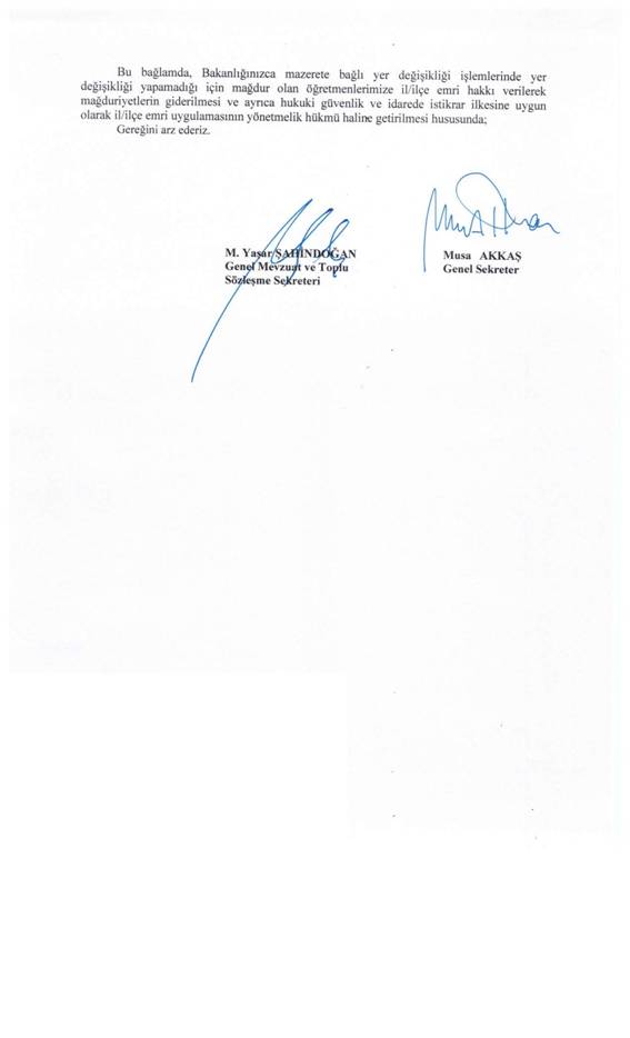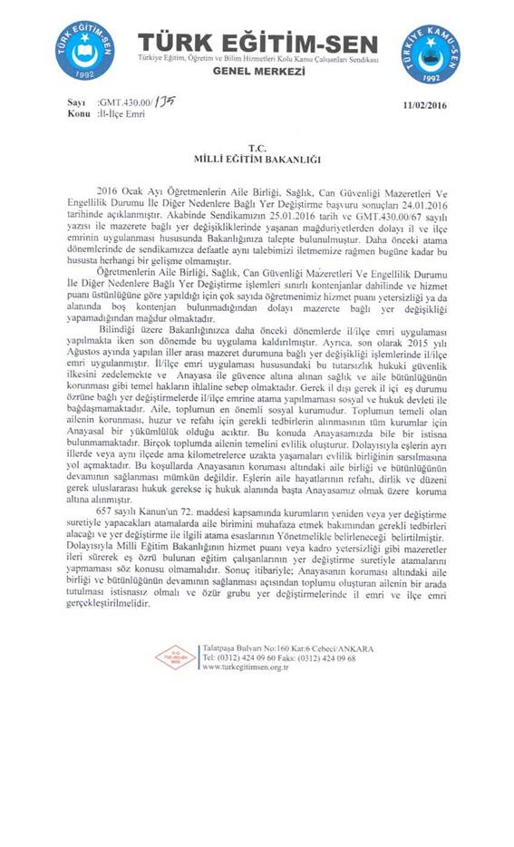 Akabinde Sendikamızın 25.01.2016 tarih ve GMT.430.00/67 sayılı yazısı ile mazerete bağlı yer değişikliklerinde yaşanan mağduriyetlerden dolayı il ve ilçe emrinin uygulanması hususunda Milli Eğitim Bakanlığına talepte bulunulmuştur. Daha önceki atama dönemlerinde de sendikamızca defaatle aynı talebimizi iletmemize rağmen bugüne kadar bu hususta Bakanlık tarafından cevap verilmemiş herhangi bir gelişme olmamıştır. Öğretmenlerin Aile Birliği, Sağlık, Can Güvenliği Mazeretleri Ve Engellilik Durumu İle Diğer Nedenlere Bağlı Yer Değiştirme işlemleri sınırlı kontenjanlar dahilinde ve hizmet puanı üstünlüğüne göre yapıldığı için çok sayıda öğretmenimiz hizmet puanı yetersizliği ya da alanında boş kontenjan bulunmadığından dolayı mazerete bağlı yer değişikliği yapamadığından mağdur olmaktadır.