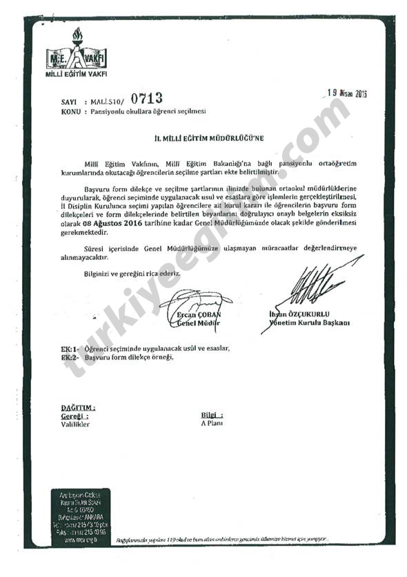 Pansiyonlu Okullara Öğrenci Seçimi Nasıl Yapılacak? Milli Eğitim Vakfı'nın MEB'e bağlı pansiyonlu okullarda okutacağı öğrencilerin seçilme şartları ilgili yazıda belirtilmiştir.