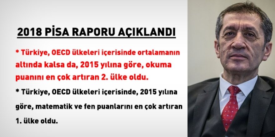 OECD, 3 yılda bir yayınladığı Pisa sonuçlarını açıkladı. Türkiye, 2017 yılına göre PISA 2018'de; okuma becerilerinde 50. sıradan 40. sıraya, matematik okuryazarlığında 49. sıradan 42. sıraya, fen okuryazarlığında 52. sıradan 39. sıraya yükseldi.