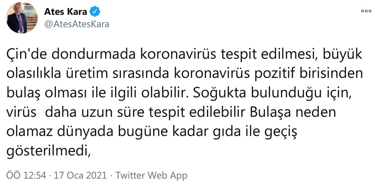 Sağlık Bakanlığı Koronavirüs Bilim Kurulu Üyesi Prof. Dr. Ateş Kara, Çin'de dondurmada corona virüsü tespit edilmesiyle ilgili sosyal medya hesabından açıklama yaptı.