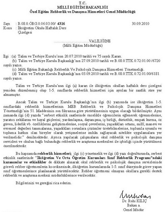 Herşey tam düzen girmiş ve rehberlik çalışmaları hak ettiği değer kavuşmuşken 2010 yılındaki haftalık ders çizelgesi değişikliği ile 1-5. Sınıflarda rehberlik/sosyal etkinlik dersi kaldırıldı. Bunun hatalı olduğuna ilişkin bakanlığa uyarı yazılarımız ve görüşmelerimiz üzerine MEB rehberlik çalışmalarının “Serbest etkinlik saatleri içinde yapılması” yönünde 30.09.2010 tarihli 4316 sayılı yazıyı yayımlayarak uygulamanın devamını sağladı.