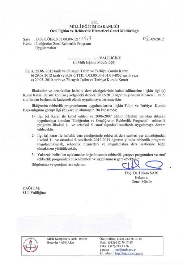 Özellikle 1 ve 5. Sınıfta rehberlik çalışmalarının kaldırıldığı zannedilmektedir. Oysa Bakanlığın 07.09.2012 tarihli 3617 sayılı yazılarında 1 ve 5. Sınıflarda rehberlik programının uygulanmayacağı belirtilmiş cümlenin devamında rehberlik hizmet ve uygulamalarının ders saatine bağlı olmaksızın yürütüleceği ifade edilmiştir. Yani rehberlik çalışmaları yıllar önce olduğu gibi bir ders saatini bağlı olmaksızın uygulanacaktır. Şube rehber öğretmenleri yönetmekte yer alan görevleriyle birlikte rehberlik çalışmalarını da planlayıp yürüteceklerdir.