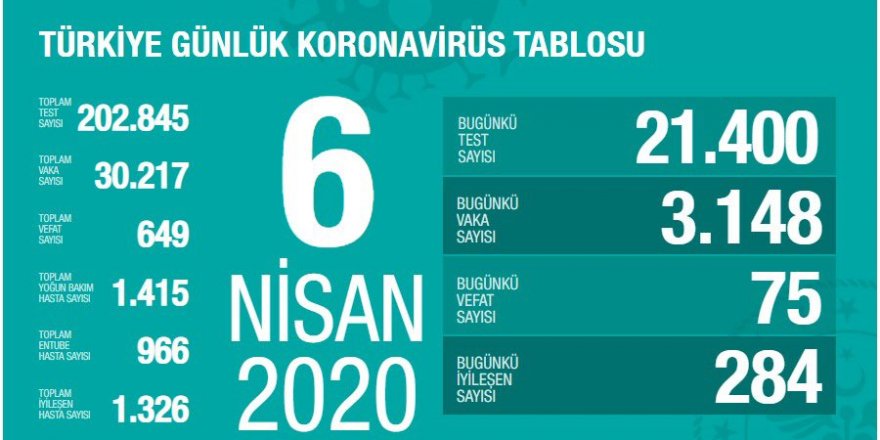 6 Nisan 2020 Koronavirüs Rakamları: 75 Vefat, 3.148 Yeni Vaka!