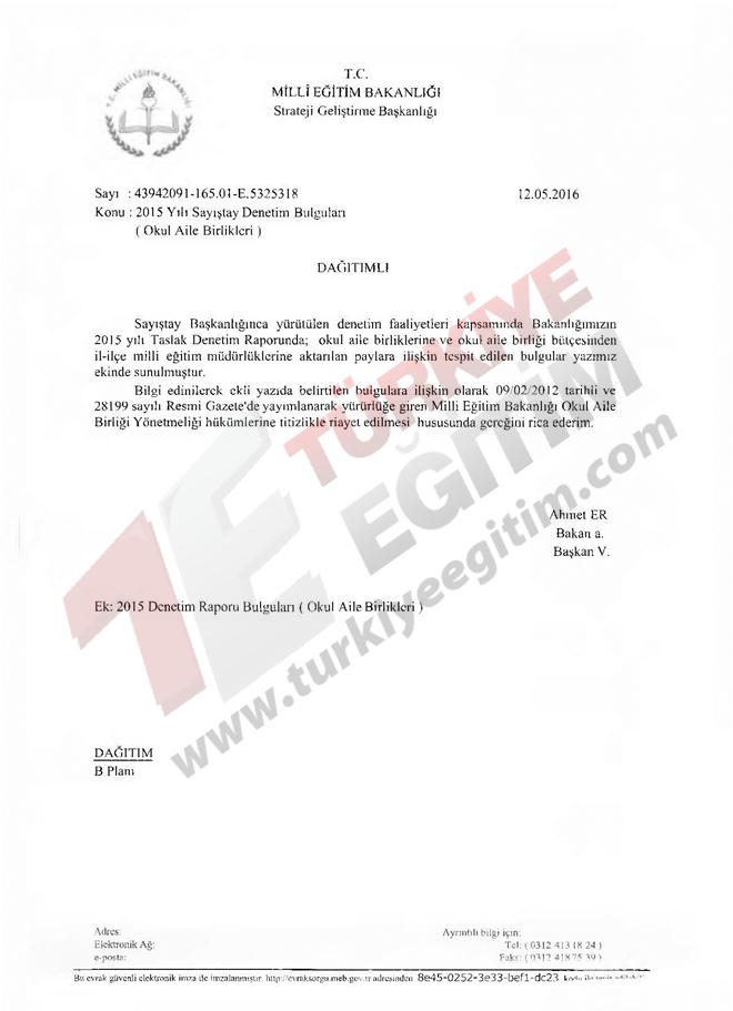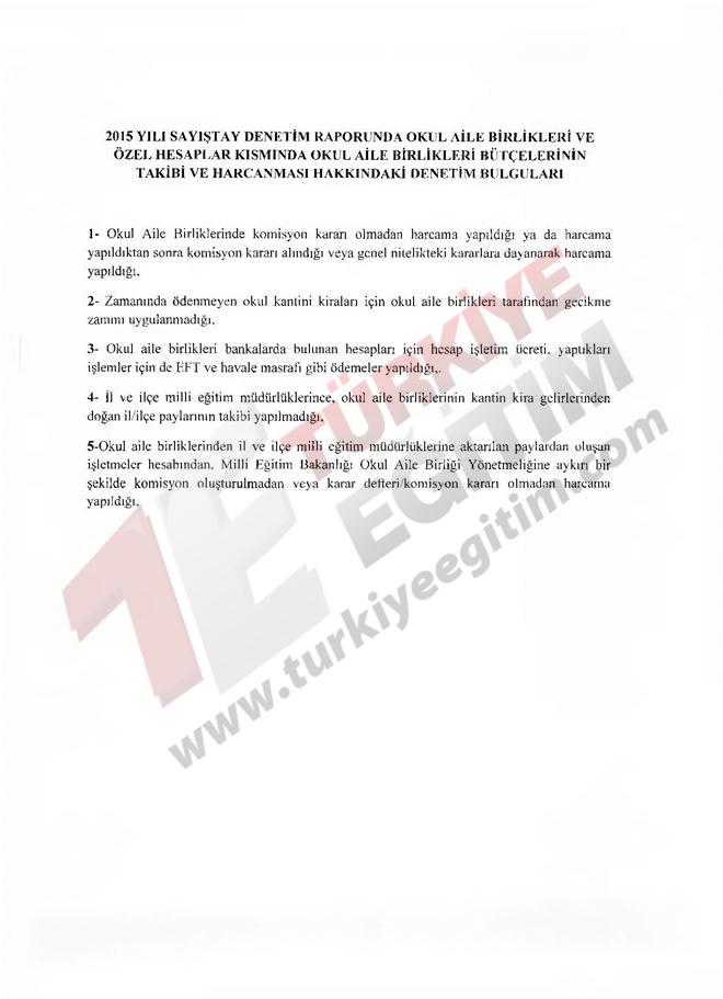 Sayıştay Başkanlığınca yürütülen denetim faaliyetleri kapsamında Bakanlığımızın 2015 yılı Taslak Denetim Raporunda; okul aile birliklerine ve okul aile birliği bütçesinden il-ilçe milli eğitim müdürlüklerine aktarılan paylara ilişkin tespitler