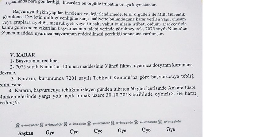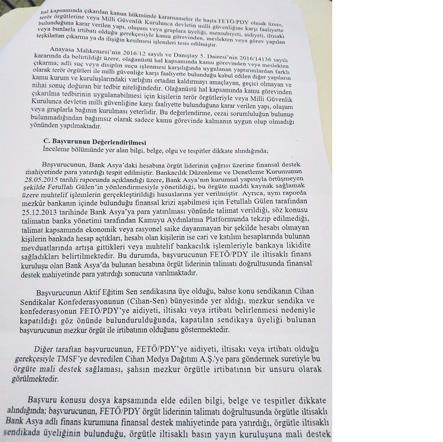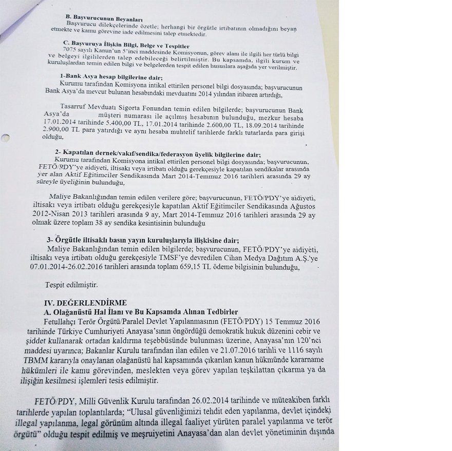 OHAL Komisyonu, Bank Asya'ya para yatıran, sendikaya 29 ay üyelik kaydı bulunan ve Cihan Medyaya 2014 ila 2016 yılları arasında ödeme yapan kamu personelinin göreve iade başvurusunu reddetti