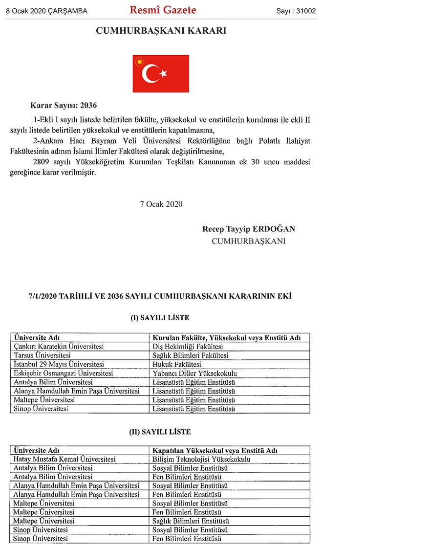 Bazı yükseköğretim kurumlarına bağlı fakülte, enstitü ve yüksekokul kurulması ve kapatılması ile adlarının değiştirilmesine ilişkin Cumhurbaşkanı kararları Resmi Gazete'de yayımlandı.