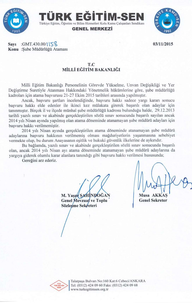 Türk-Eğitim Sen Bakanlığa gönderdiği yazıda, yazılı sınav ve akabinde gerçekleştirilen sözlü sınav sonucunda başarılı olan, ancak 2014 yılı Nisan ayı atama döneminde atanamayan şube müdürü adaylarına da yargıya giderek olumlu karar alanlara tanındığı gibi başvuru hakkı verilmesi hususunda talepte bulundu.
