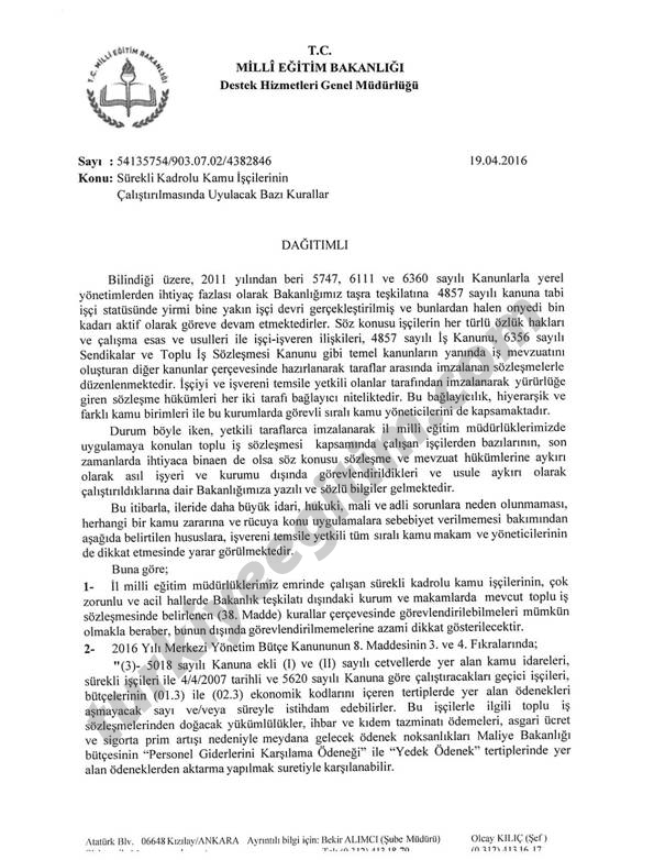 MEB Destek Hizmetleri Genel Müdürlüğü'nün Sürekli Kadrolu Kamu İşçilerinin Çalıştırılmasında Uyulacak Bazı Kurallar Yazısı