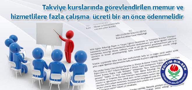 Bu nedenle, Bakanlıktan, takviye kurslarındaki memur ve hizmetlilerin görevlendirilme usul ve esaslarını düzenleyecek ve bu suretle farklı uygulamalara ve adaletsiz işlemlere son verecek genel bir yazının illere gönderilmesini, bu çalışmaların fazla çalışma kapsamında toplu sözleşme hükmüne göre ücretlendirilmesi gerektiğinin illere hatırlatılmasını istedik.