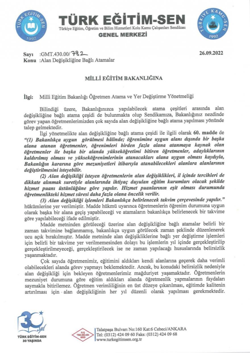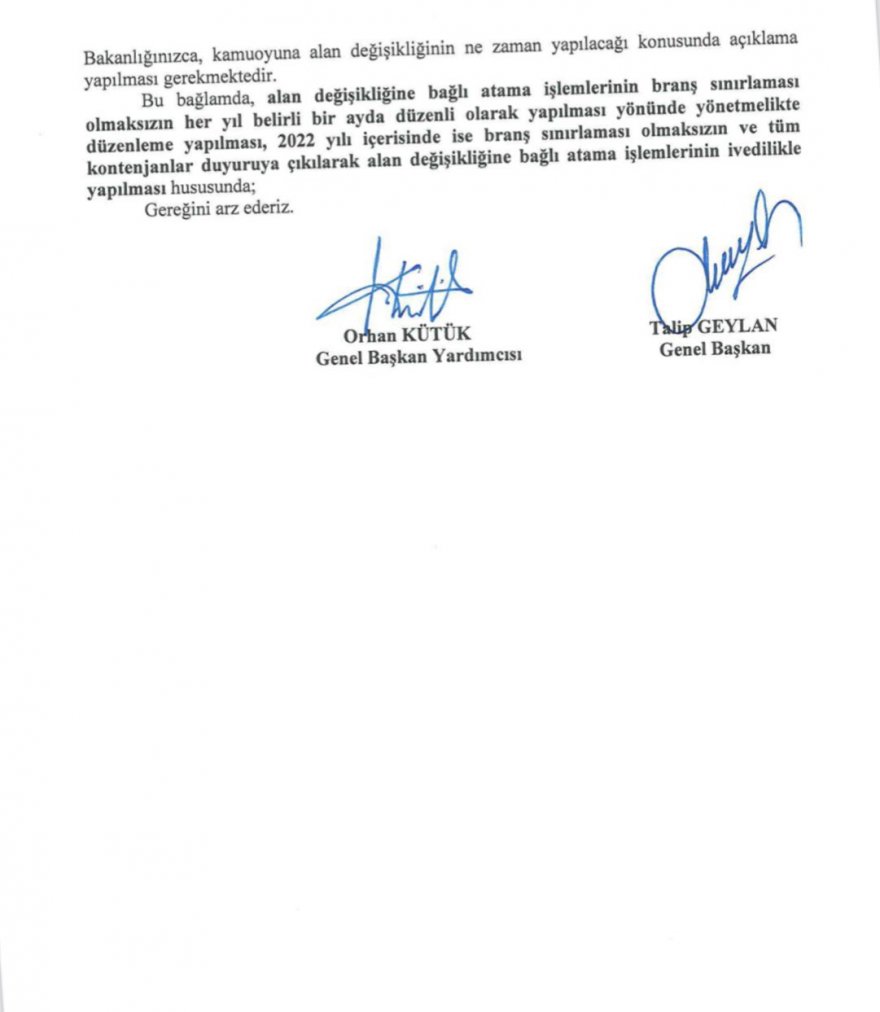 Geylan açıklamasında şu ifadelere yer verdi: "Alan değişikliğine dair çok sayıda mesaj alıyorum. Sendikamız 26 Eylül’de @tcmeb e yazılı başvurmuş, branş sınırlaması olmaksızın ve tüm kontenjanların duyuruya çıkarılarak takvimin bir an önce başlatılmasını talep etmiştir. Süreci yakınen takip ettiğimizin bilinmesini istiyorum."