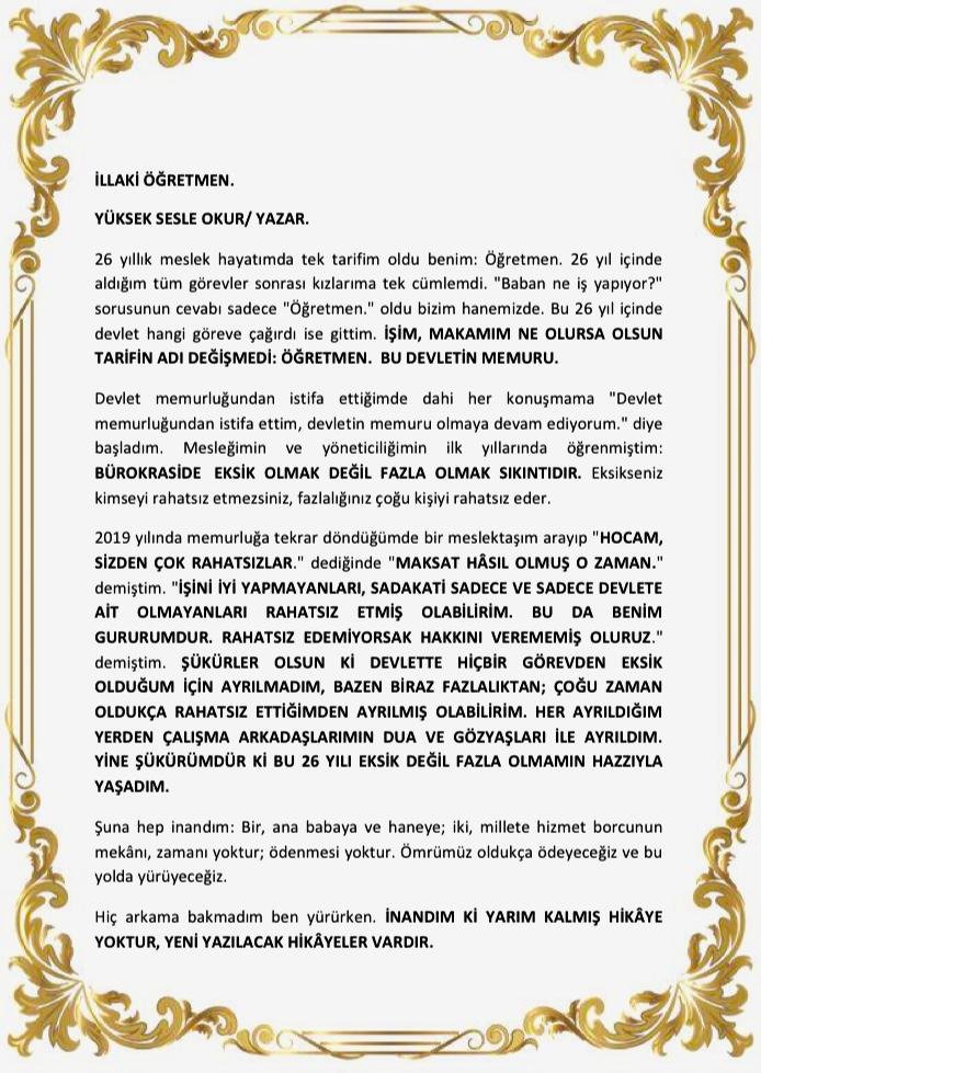 2) 2019’da, “Bir şeyler değişiyor” ümit ve sevinciyle ÖĞRETMEN olarak devlet memurluğuna döndüğündeki heyecanına şahidim. Son iki yıldır ortaya koyduğu gayret ve ürettiği hizmetlerle de eğitim kamuoyunun haklı takdirine mazhar oldu.