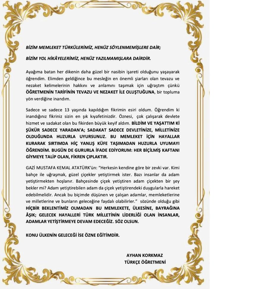 1) Ayhan Korkmaz’ı; mesleğine aşık bir öğretmen,liyakat sahibi bir yönetici ve tek derdi memleket olan bir vatansever olarak bilirim. 2014’te günahkar mülakat çetelerinin ahlaksızlıklarıyla hakkı gasp edildiğinde dahi devletine olan inancını kaybetmedi. +