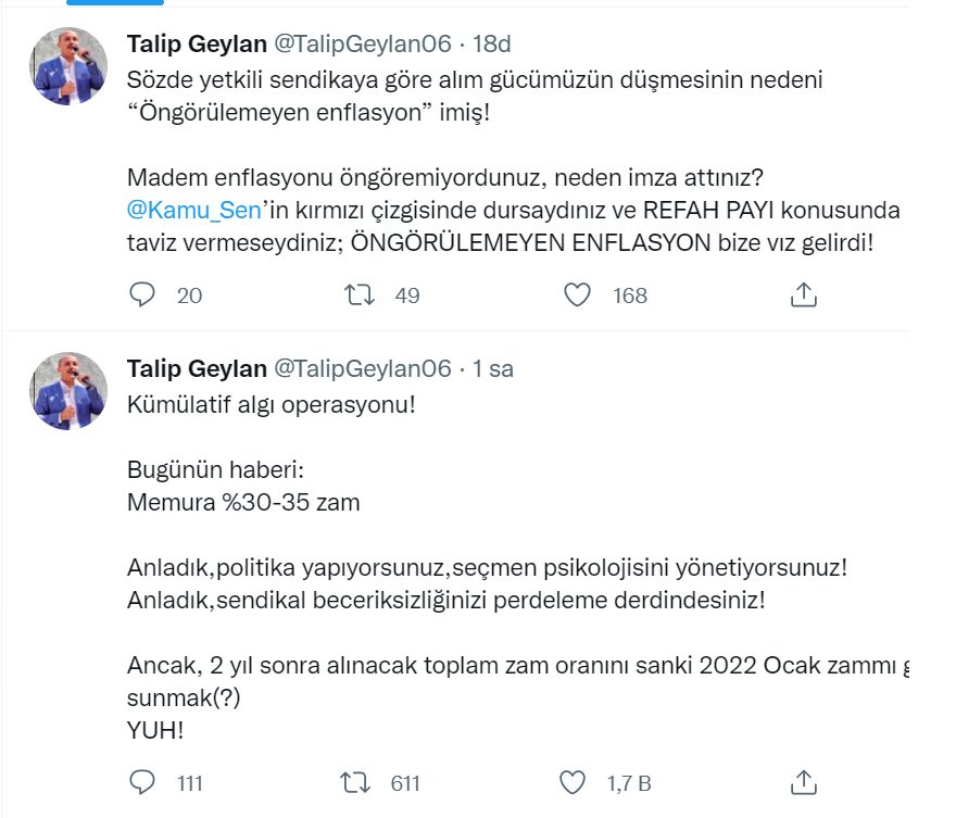 Kamuoyuna "Memura yüzde 30-35 zam" şeklinde yansıtılan haberlere tepki gösteren Türk Eğitim-Sen Genel Başkanı Talip Geylan sosyal medya hesabından şu açıklamalarda bulundu: