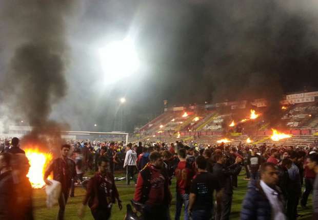 Saha içine giren binlerce taraftar, kale fileleri ve direklerine ile reklam panolarını sökmeye başladı.
