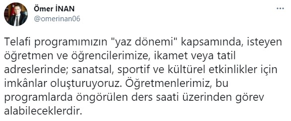 Genel Müdür İnan, yaptığı paylaşımda, "Telafi programımızın 'yaz dönemi' kapsamında, isteyen öğretmen ve öğrencilerimize, ikamet veya tatil adreslerinde; sanatsal, sportif ve kültürel etkinlikler için imkanlar oluşturuyoruz. Öğretmenlerimiz, bu programlarda öngörülen ders saati üzerinden görev alabileceklerdir" ifadelerini kullandı.