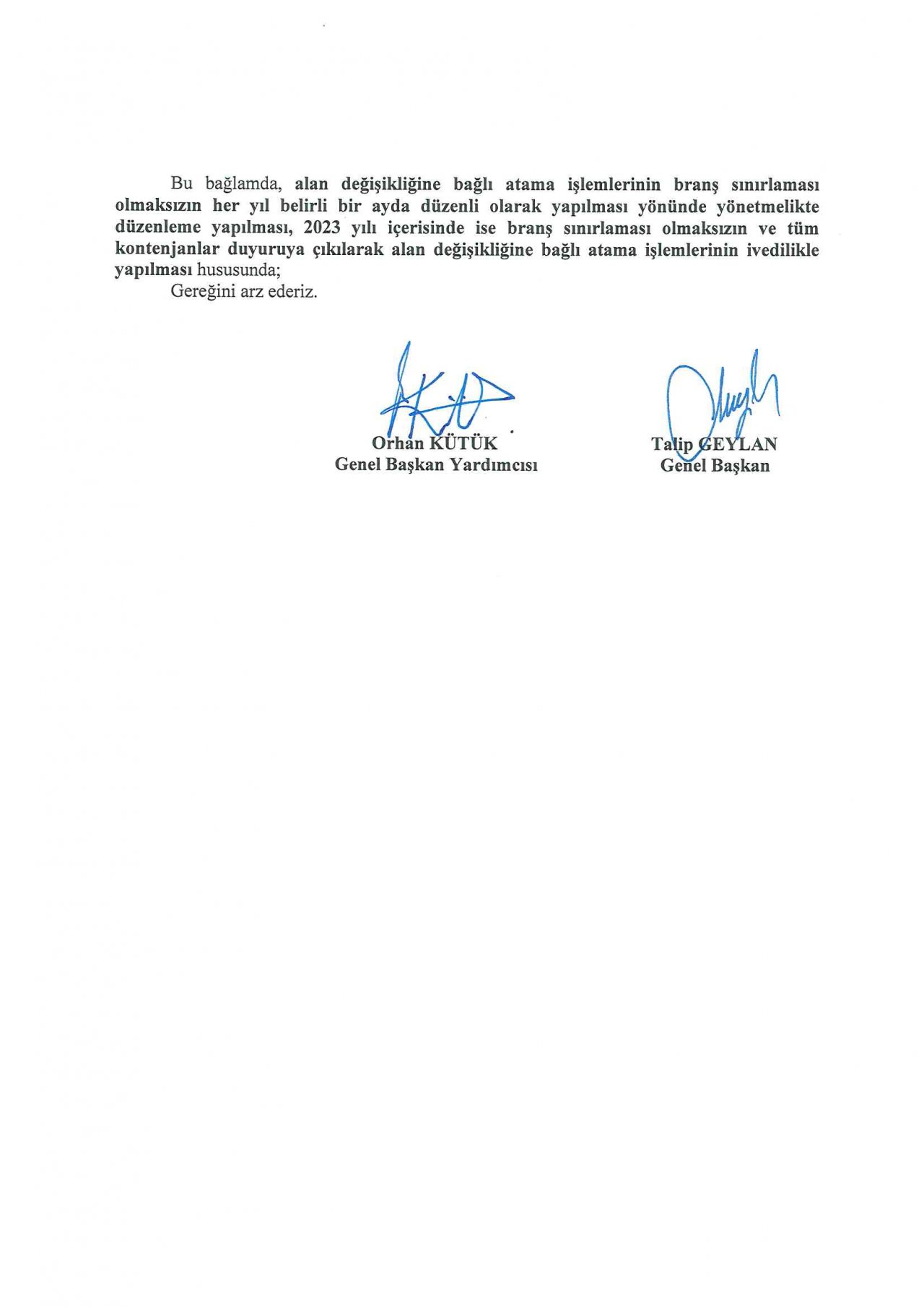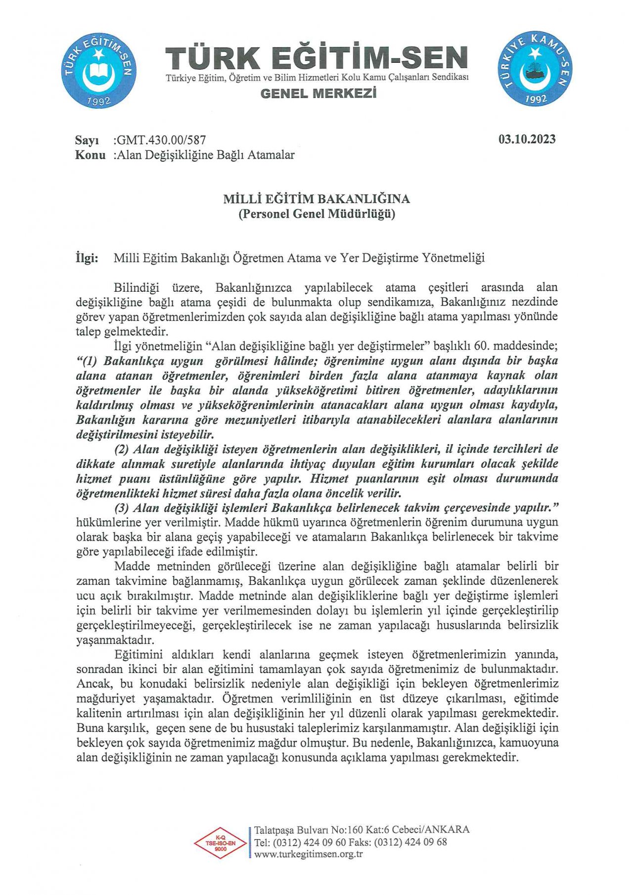Türk Eğitim-Sen olarak; alan değişikliğine bağlı atama işlemlerinin branş sınırlaması olmaksızın her yıl belirli bir ayda düzenli olarak yapılması yönünde yönetmelikte düzenleme yapılması, 2023 yılı içerisinde branş sınırlaması olmaksızın ve tüm kontenjanlar duyuruya çıkılarak alan değişikliğine bağlı atama işlemlerinin ivedilikle yapılması hususunda; MEB’e talepte bulunduk.