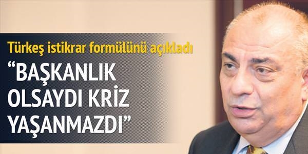 Türkeş, "Türkiye'ye uygun bir başkanlık sistemi faydalı olur. Eğer başkanlık sistemi olsaydı, 7 Haziran'daki kriz yaşanmayacaktı. Başkan seçilecekti, yürütme belirlenecekti." dedi.