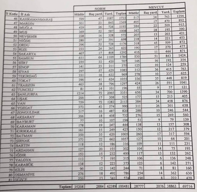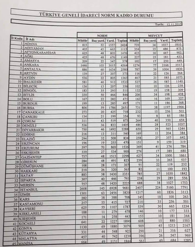 Türkiye Geneli Müdür/Müdür Yardımcısı Boş Normlar